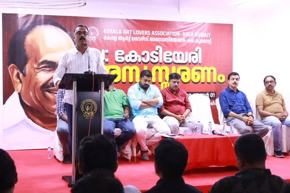 കുവൈറ്റ് സിറ്റി: മുൻ ആഭ്യന്തര മന്ത്രിയും സി പി എമ്മിന്റെ സമുന്നത നേതാവുമായിരുന്ന കോടിയേരി ബാലകൃഷ്ണന്റെ മൂന്നാം ചരമവാർഷിക ദിനത്തിൽ കേരള ആർട്ട് ലവേഴ്സ് അസോസിയേഷൻ - കല കുവൈറ്റിന്റെ നേതൃത്വത്തിൽ അനുസ്മരണ സമ്മേളനം സംഘടിപ്പിച്ചു. കല കുവൈറ്റ് പ്രസിഡന്റ് മാത്യു ജോസഫിന്റെ അധ്യക്ഷതയിൽ ഒക്ടോബർ 1 ബുധനാഴ്ച അബുഹലീഫ കല സെന്ററിൽ നടന്ന സമ്മേളനത്തിൽ അബുഹലീഫ മേഖല സെക്രട്ടറി കെ ജി സന്തോഷ് അനുസ്മരണ കുറിപ്പ് അവതരിപ്പിച്ചു. കല കുവൈറ്റ് നേതാക്കളായ, മലയാളം മിഷൻ കുവൈറ്റ് ചാപ്റ്റർ സെക്രട്ടറി ജെ സജി, ലോകകേരള സഭ അംഗം ആർ നാഗനാഥൻ, സി കെ നൗഷാദ് എന്നിവർ അനുസ്മരണ സമ്മേളനത്തിൽ സഖാവ് കോടിയേരിയെ സ്മരിച്ചു കൊണ്ട് സംസാരിച്ചു.